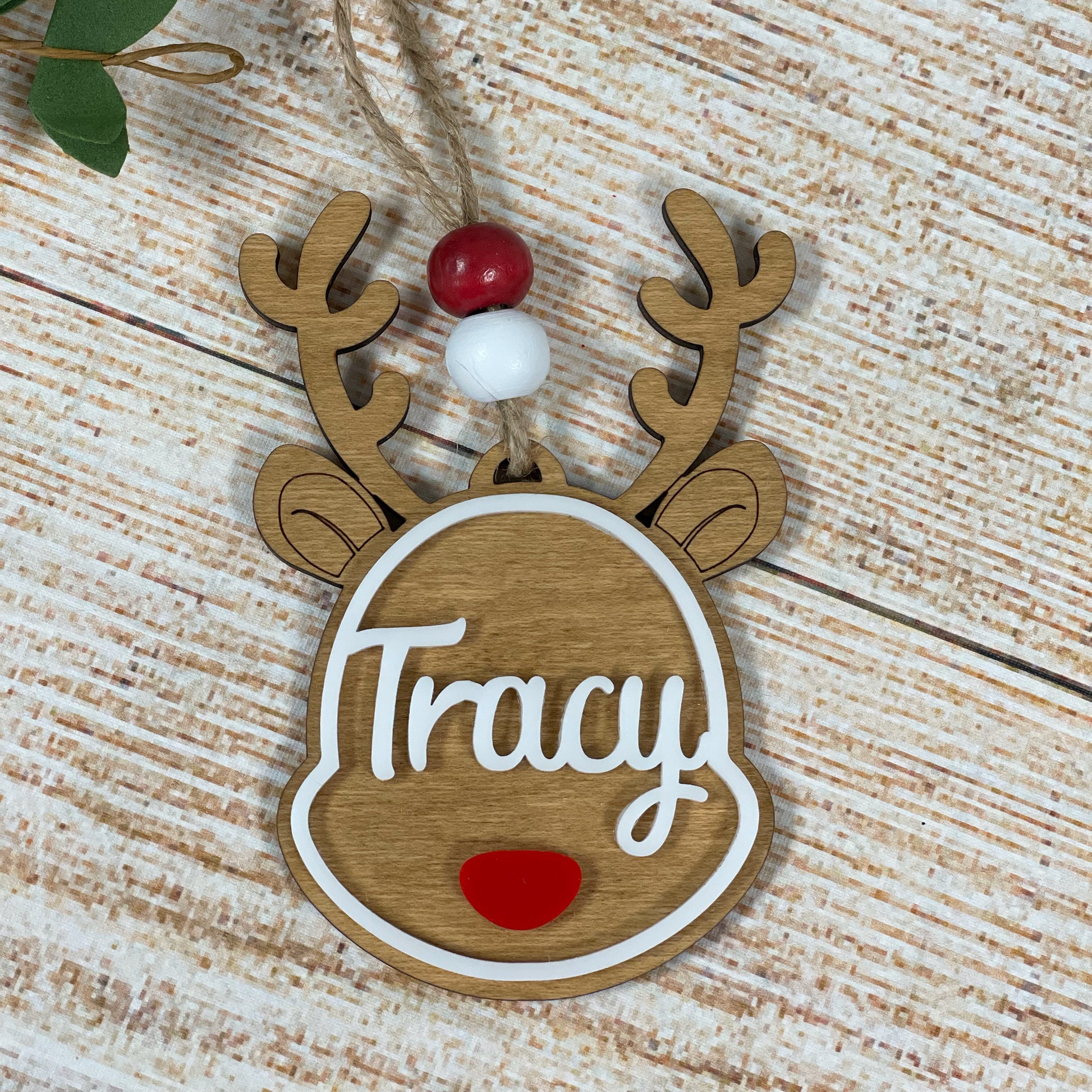 Crafted from birch wood with white acrylic outline and name with red nose.